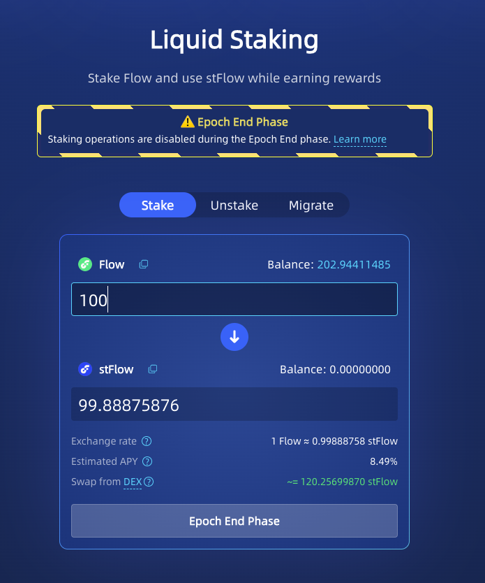 * You may notice the `Epoch End Phase` warning below. Due to Flow's underlying staking mechanism, no staking operation will be allowed during epoch end phase (to be exact, it's called epoch setup & epoch commit, see [here](https://developers.flow.com/nodes/staking/schedule)), and it typically lasts several hours.