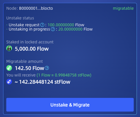 * And any migratable (unclaimed rewards, unstaked, newly commited) amount will be migrated and you'll receive corresponding amount of `stFlow`;