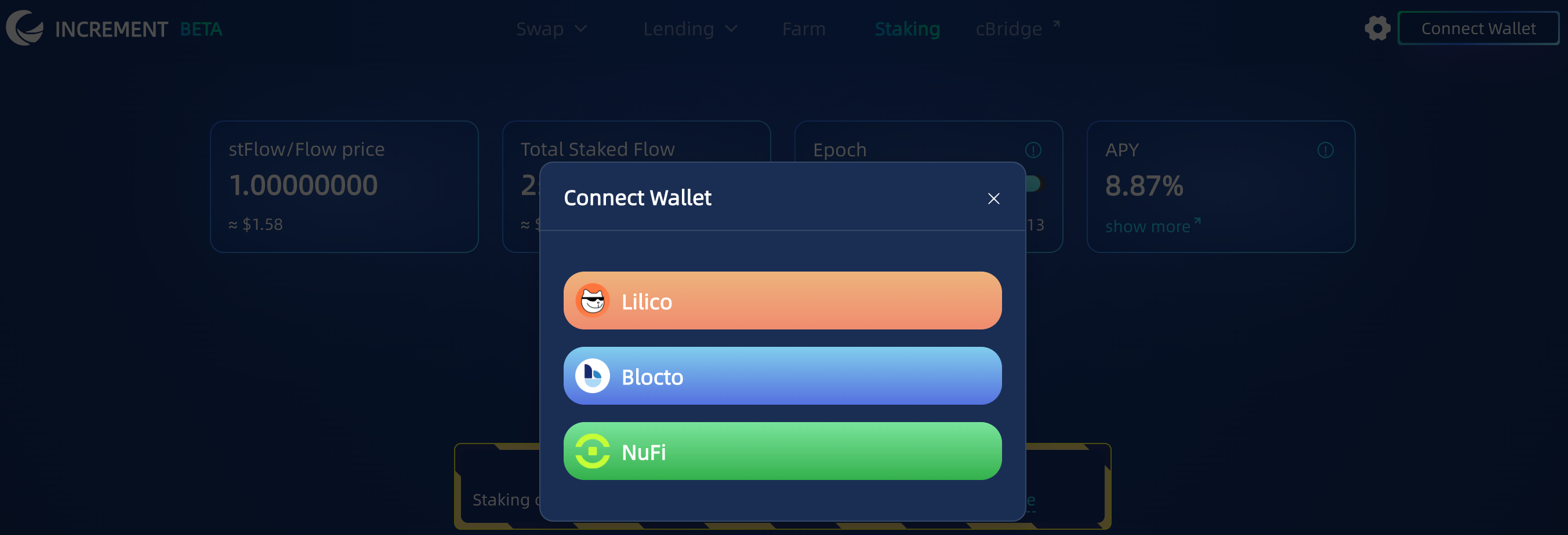 It now supports 3 most widely-used wallets on Flow: Lilico (non-custodial), Blocto (custodial), and NuFi (non-custodial). More wallets will be intergrated in future.&#x20;
